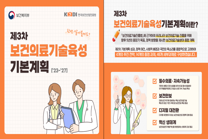 제3차 보건의료기술육성 기본계획은 ‘모든 국민이 건강한 헬스케어 4.0시대 구현’을 비전으로, 보건의료기술 향상, 보건안보 위기 시 100일내 대응시스템 구축, 바이오헬스 수출 확대를 목표로 하여 4대 추진전략, 14대 중점과제, 46개 세부과제로 구성돼 있다.